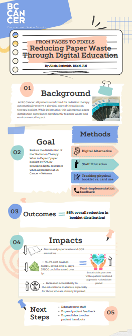 ![]() | From Pages To Pixels: Reducing Paper Waste Through Digital EducationProject Lead: Alicia Scrimbit (BC Cancer Kelowna) Background: The distribution of paper radiation therapy booklets to every patient receiving radiation therapy generates significant paper waste, contributing to negative environmental impact Project Aim: By June 2025, reduce the distribution of the “Radiation Therapy: What to Expect” paper booklet by 70% by providing digital resources when appropriate at BC Cancer – Kelowna. Outcome: 56% overall reduction in booklet distribution | |