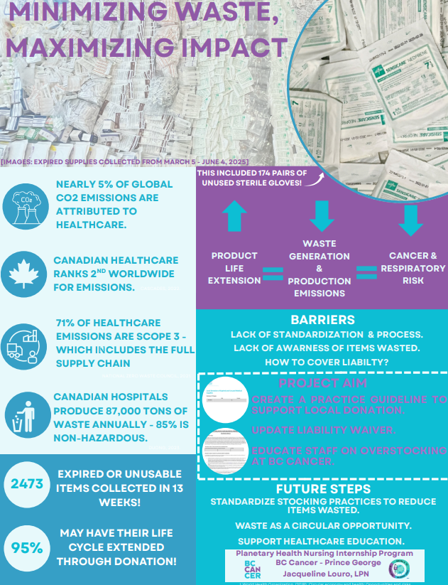 ![]() | Minimizing Waste, Minimizing ImpactProject Lead: Jacqueline Louro (BC Cancer Prince George) Background: Expired, unused products going into the garbage monthly. PHSA and BC Cancer does not have a policy to support, track amount, or cover liability of supply donation. Project Aim: To create a SHOP guideline for BC Cancer - Centre for the North to support local donation of expired, unused items from BCC PG to be submitted for approval by Policy Management before June 27, 2025. Outcome: SHOP guideline is pending approval. | |||||||||||||||||||