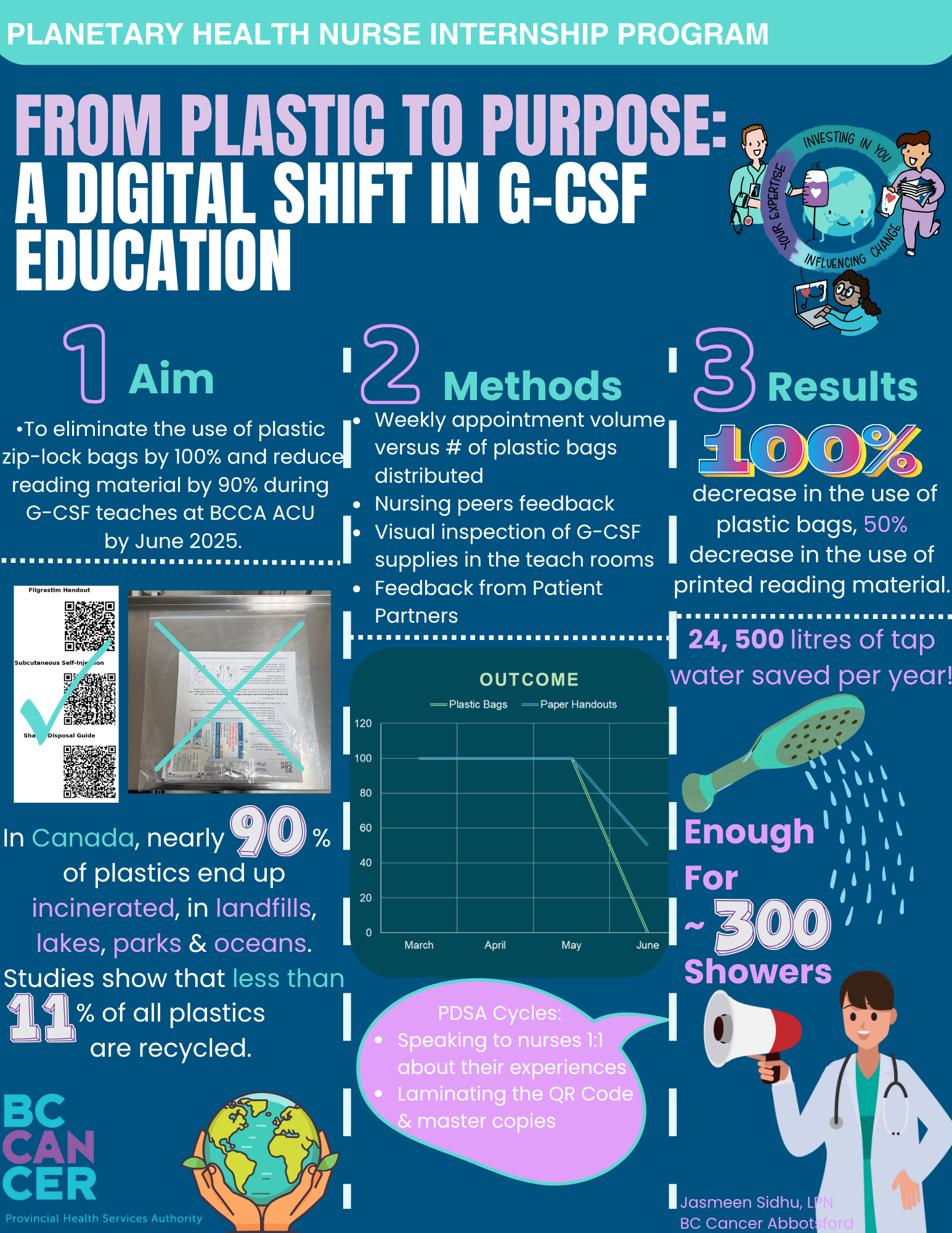 Project #1![]() From Plastic to Fantastic: Reducing Single-Use Ziplock Bags at BC Cancer - Infographic Project Lead: Devi Milligan, RN, CON(C)Background: In Prince George, systemic therapy medications are triple wrapped, using double bagging and a reusable plastic box, which exceeds regulatory requirements and creates unnecessary waste. These bags are considered hazardous, and therefore must then be incinerated, which produces 30X more greenhouse gas emissions than other waste processing methods. Prior to project implementation, Centre for the North used approximately 70 plastic bags per week (or 3666 bags per year) as the second layer of plastic. Project Aim: Permanently stop using a second sealable plastic bag to wrap systemic therapy medications going to the chemo unit by December 2024. Outcome & Environmental Impacts: 100% reduction in 2nd bag usage over a 12 week period. Reduced costs for bags, waste containers, and incineration. Less plastic waste being incinerated, decreasing the GHG emissions. Faster workflow for pharmacy staff with less repetitive strain, decreasing the chance of workplace injuries. Increased staff morale and satisfaction from supporting environmental goals. Increased planetary health awareness and strengthened team connections. |