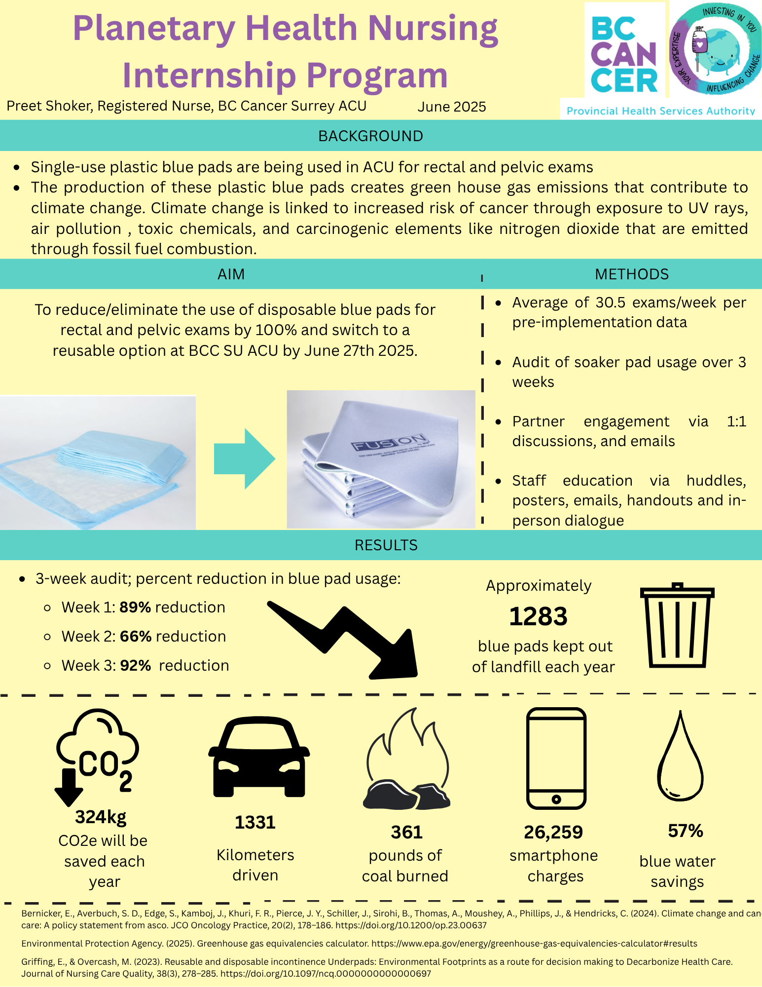Project #1![]() Ditch the Blue Pad: A Planetary Health Initiative - Infographic Project Lead: Claire Liem (BC Cancer Surrey)Background: All patients requiring peripheral IV insertions at BC Cancer Surrey (systemic therapy department) are wrapped in a warm moist towel which is covered in a plastic disposable blue pad. Disposable blue pads contain microplastics (specifically polypropylene), which breakdown in landfills and can contaminate our water supplies, with data showing that microplastics found in drinking water may be linked to an increased risk of cancer. Project Aim: Decrease disposable blue pad use for warm moist peripheral IV starts by 80% at BC Cancer Surrey Systemic Therapy department by August 15, 2024. Outcome & Environmental Impact: Blue pad use for peripheral IV insertions decreased by 90-95%, saved ~320 blue pads during trial period, and potential to keep 15,379 disposables blue pads out of landfill per year. Alternatively, dry heat methods were used for peripheral IV starts, which do not require disposable blue pads. |