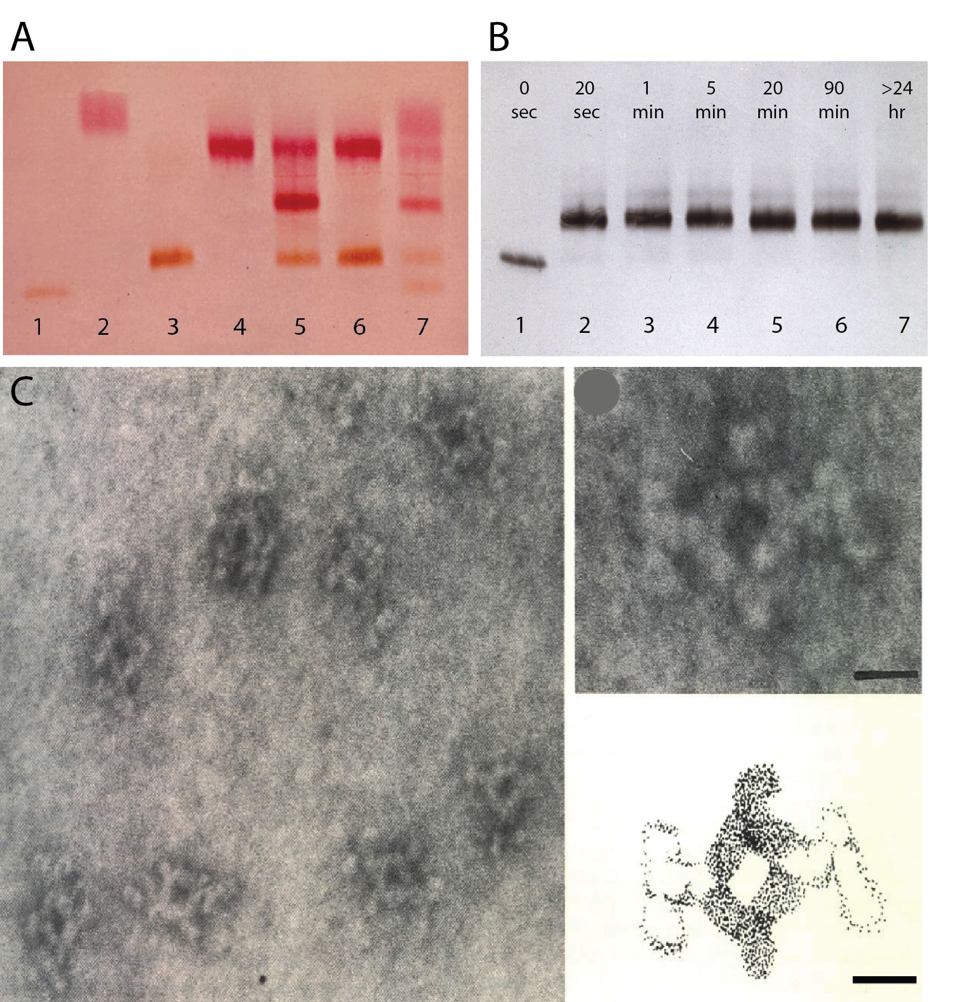 Figure 1. Tetrameric complexes of monoclonal rat and mouse antibodies (from (3). A. Staining for peroxidase and alkaline phosphatase following agar gel electrophoresis of mouse IgG1 anti-enzyme antibodies before and after addition of selected monoclonal rat anti-mouse IgG1. Lane 1: mouse IgG1 anti-peroxidase (a). Lane 2: mouse IgG1 anti- alkaline phosphatase (b). Lane 3: mouse IgG1 anti peroxidase plus an equimolar amount of rat anti-mouse IgG1. Note: no free mouse antibody. Lane 4: mouse IgG1 anti- alkaline phosphatase plus rat anti-mouse IgG1. Lane 5: equimolar amounts of mouse IgG1 anti- peroxidase and mouse IgG1 anti- alkaline phosphatase mixed before addition of an equimolar amount of rat anti-mouse IgG1. Note middle band with bispecific monoclonal tetrameric antibody complexes! Lane 6:  A mixture of the complexes shown in lane 3 and 4. Note the absence of bispecific complexes, indicating high stability of tetrameric antibody complexes. Lane 7. As lane 5, using a limiting amount of rat anti-mouse IgG1 which shows free mouse IgG1 antibodies. B. Time course of tetrameric antibody complex formation. Mouse IgG1 anti-peroxidase (lane 1) was mixed with an equimolar amount of monoclonal rat anti-mouse IgG1. At the indicated time points the mixture was subjected to agarose gel electrophoresis and anti-peroxidase was visualized after blotting as in A. Note that antibody complexes are formed within seconds and not affected by electrophoresis. C. Scanning electron microscopy of purified tetramolecular antibody complexes. Scale bar 10 nm.