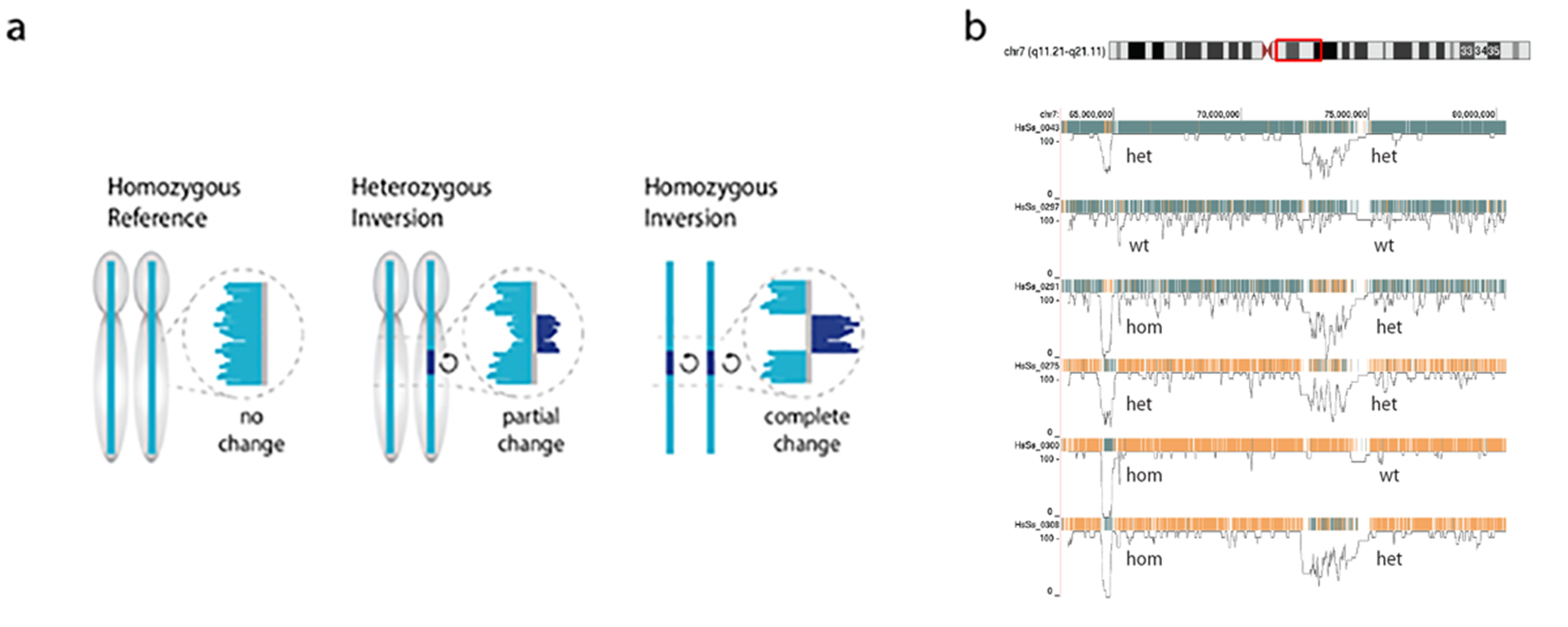 Figure. Sequence reads generated by Strand-seq map either concordant with the human reference genome sequence (a, left) or map to both strands of the reference genome (reflecting a heterozygous inversion (a, middle panel) or completely to the opposite strand of the reference genome reflecting a homozygous inversion (a, right panel). Polymorphic inversions in the human genome generate a large amount of genetic diversity between individuals  as is shown in b for a 20Mb segment of chr 7 (red box) for 6 individuals. Note that the role of this type of genetic diversity is largely unexplored because of the difficulty to generate genome-wide information about polymorphic inversions using other sequence modalities.